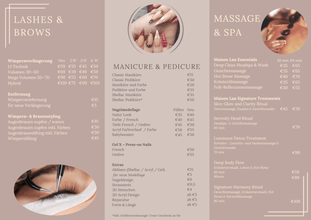 Ob elegantes Nageldesign, entspannende Facials, professionelles Lash- & Brow-Styling, wohltuende Körperbehandlungen – bei uns finden Sie exklusive Treatments für Sie und Ihn, die Ihre natürliche Schönheit zum Strahlen bringen.